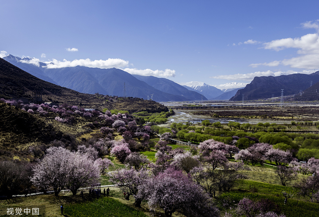 西藏林芝,桃花朵朵映雪山。王伟时/视觉中国