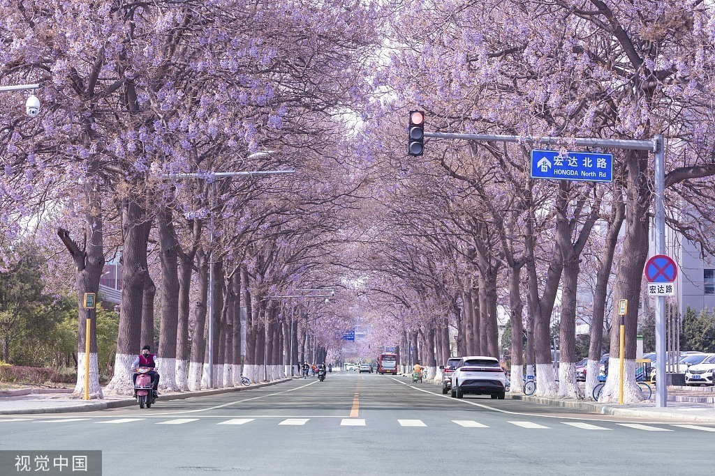 成都,红星桥锦江河畔泡桐花竞相怒放,成为河畔难得一见的春景。高寒/视觉中国