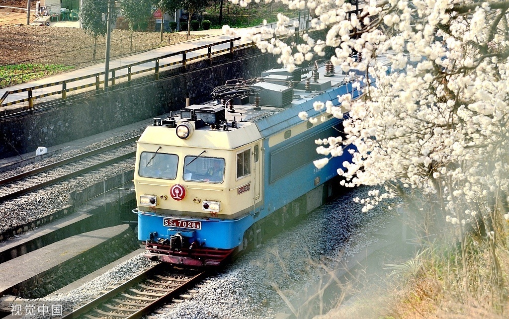 一列火车正从陕西省汉中市开满樱桃花的宝成线上驶过。 吴天文/视觉中国