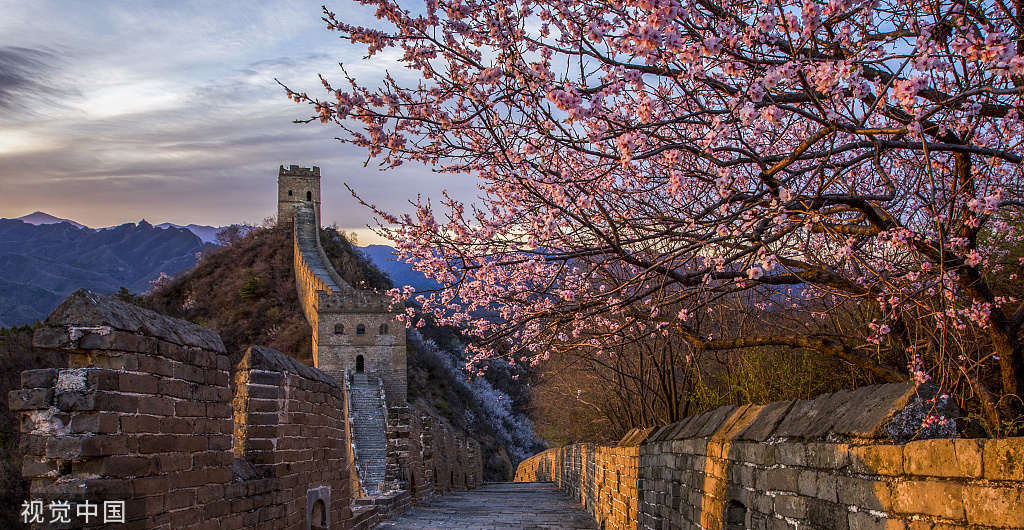 河北滦平,金山岭长城东段杏花入墙,更是把蜿蜒的长城装点的分外妖娆。 杨东/视觉中国