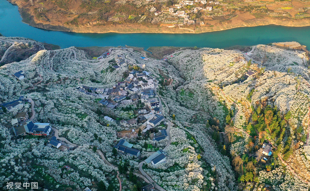 贵州毕节,织金县马场镇凹河两岸的玛瑙红樱桃花盛开。 秦刚/视觉中国