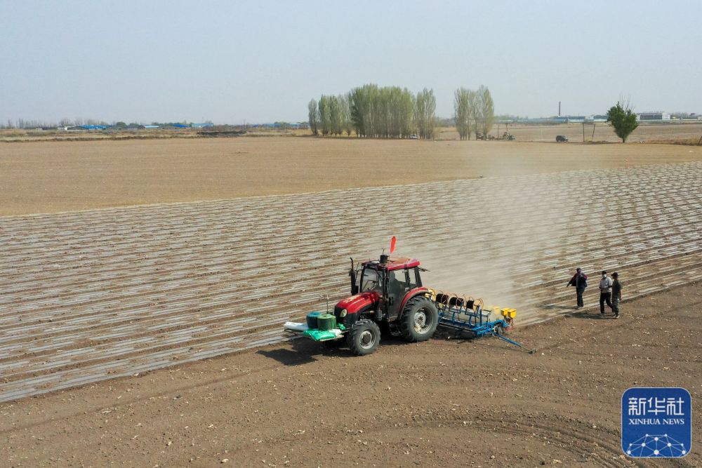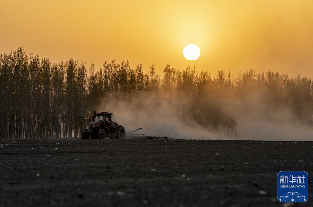 ↑在新疆生产建设兵团第六师共青团农场,搭载北斗导航系统的播种机在棉田作业(4月19日摄)。新华社记者 丁磊 摄