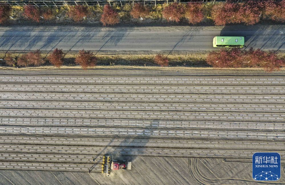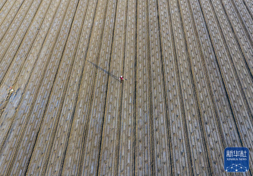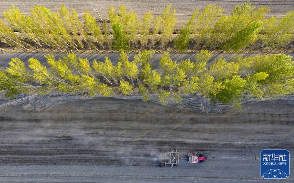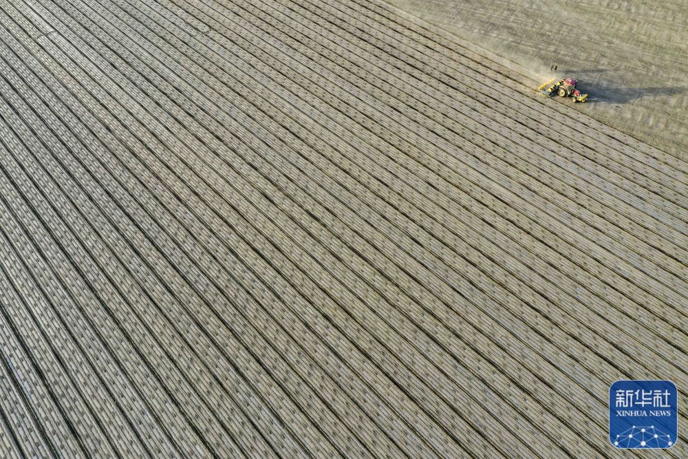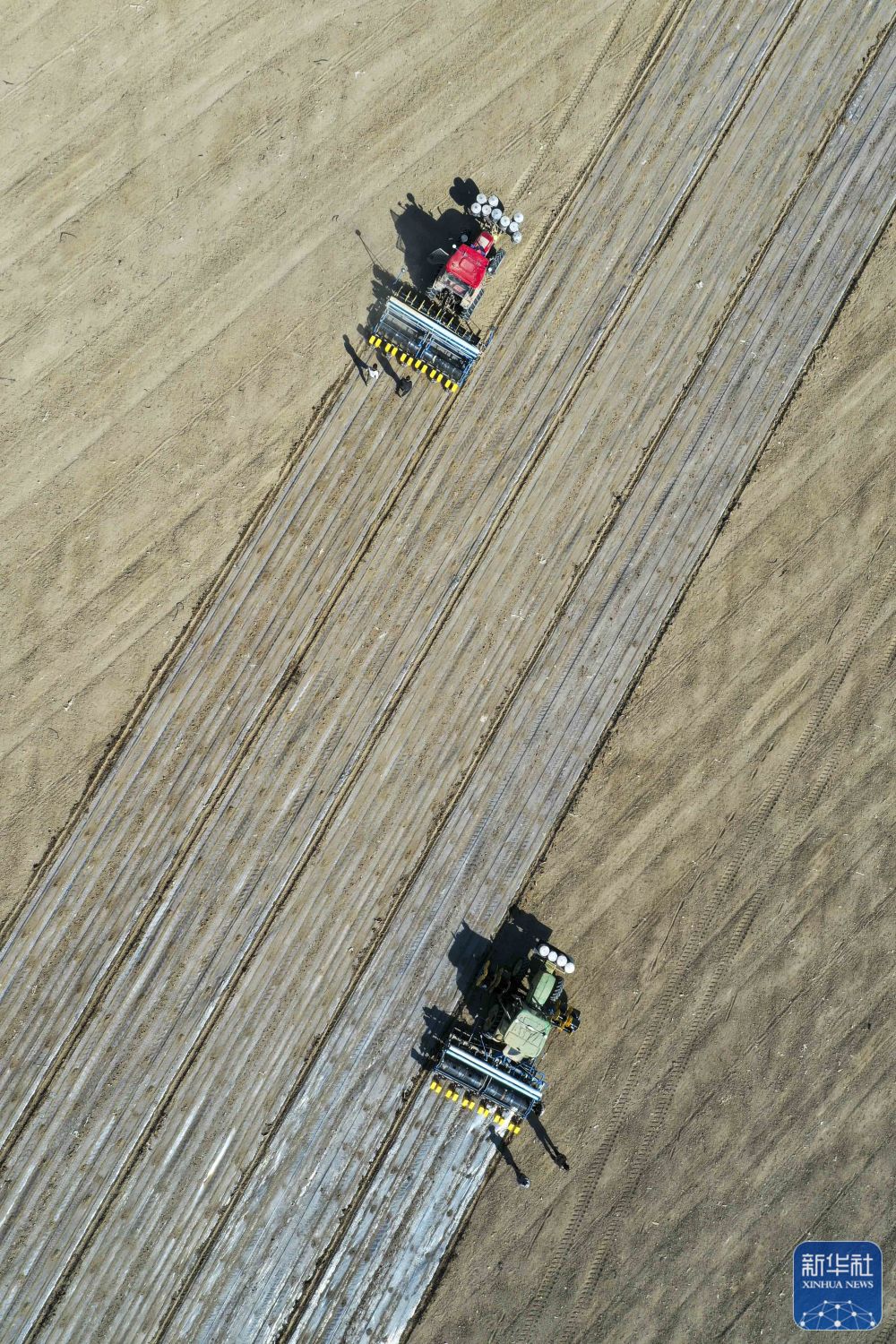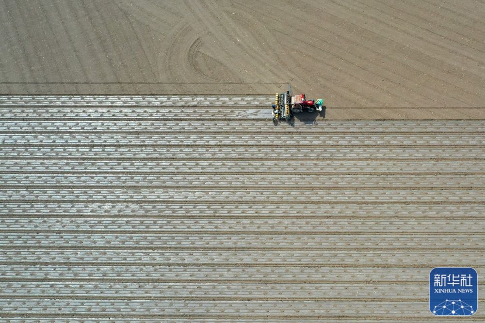 ↑播种机按照卫星导航设定的路线驶过棉田,地膜、滴灌带铺设和棉种播种一次性全部完成,一条条“地膜带”整齐排列(4月19日摄,无人机照片)。新华社记者 丁磊 摄