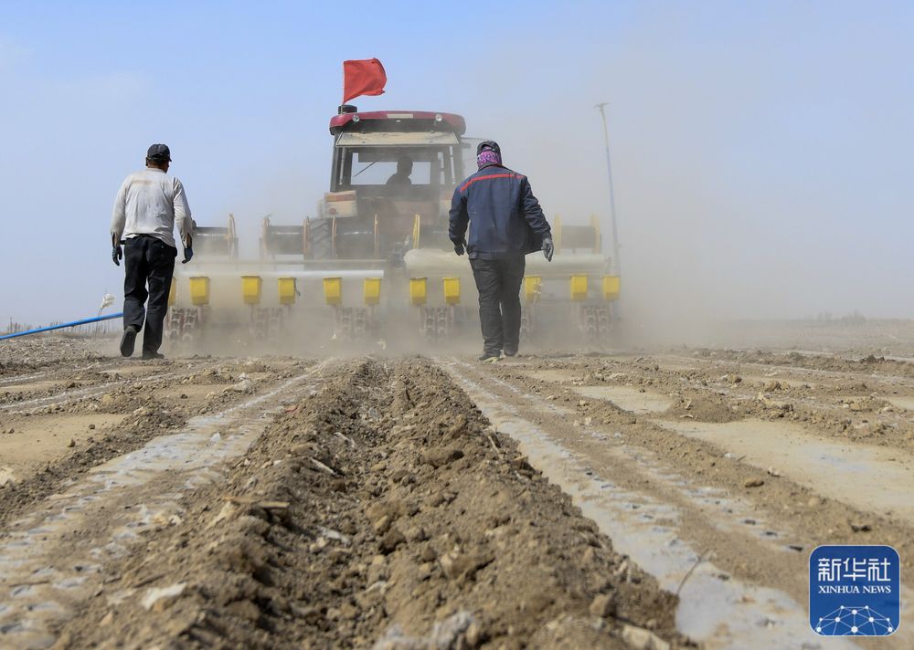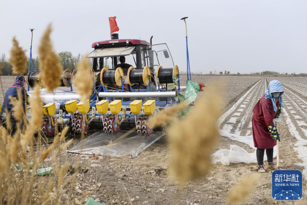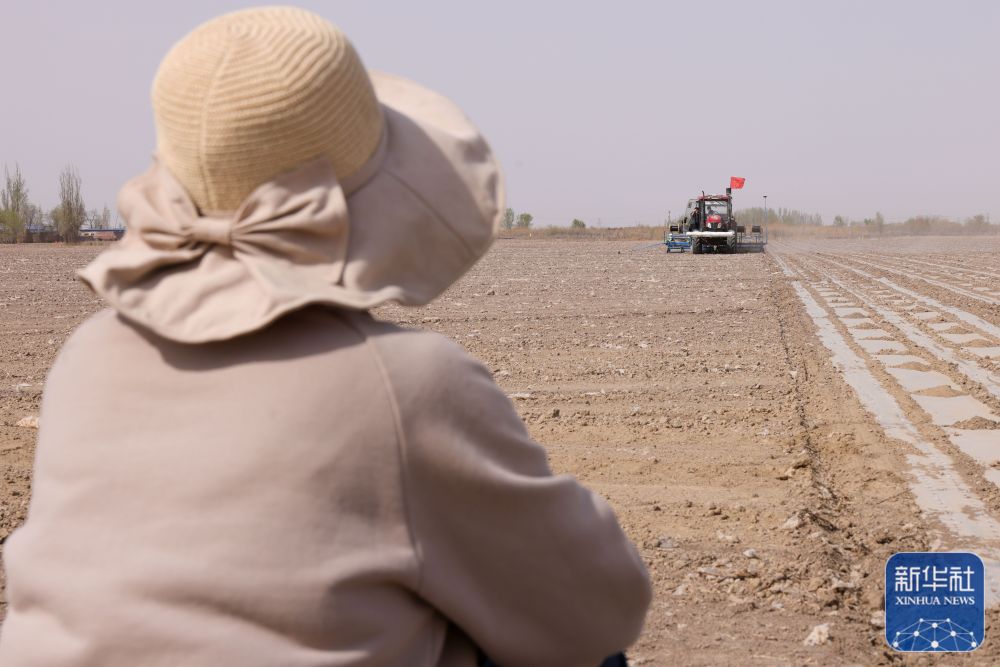↑在新疆生产建设兵团第六师共青团农场,棉农在查看播种情况(4月19日摄)。新华社记者 王菲 摄