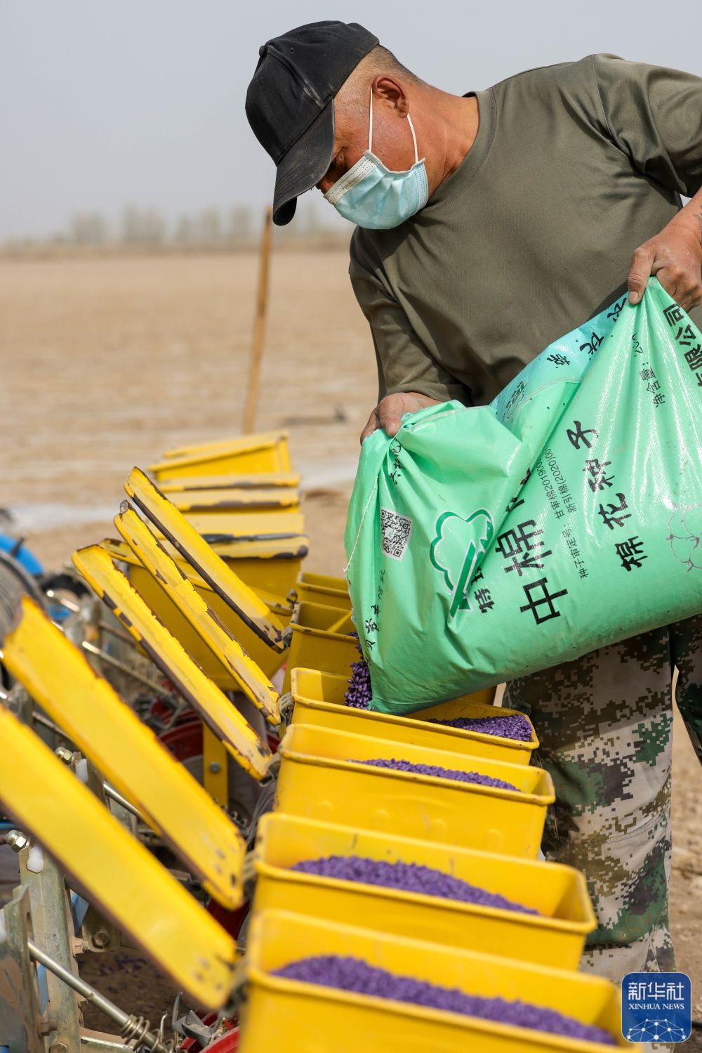 ↑在新疆生产建设兵团第六师共青团农场,棉农在给播种机添加棉花种子(4月19日摄)。新华社记者 丁磊 摄