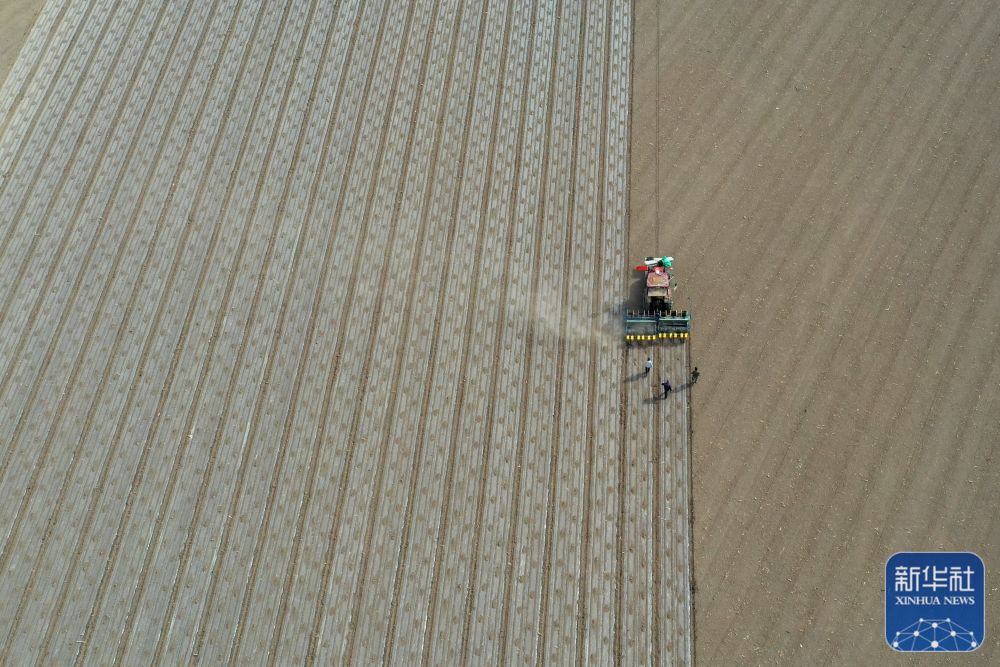 ↑这是在新疆沙湾市拍摄的一处机械化春播现场(4月18日摄,无人机照片)。新华社记者 胡虎虎 摄