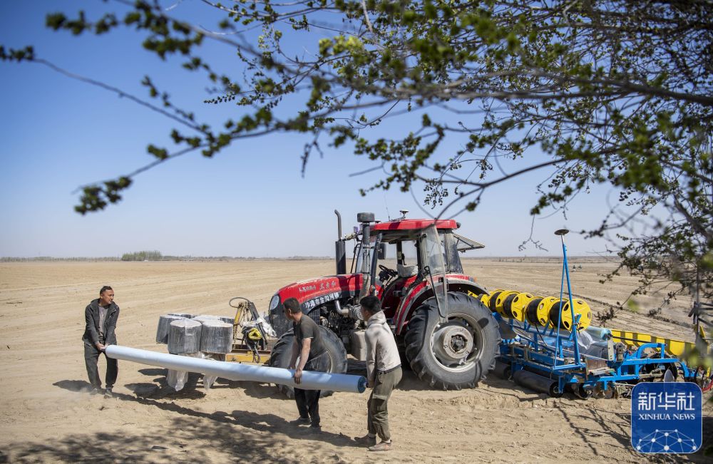↑在新疆沙湾市大泉乡叶家湖村,几名工人在棉田搬运播种时要使用的地膜(4月16日摄)。新华社记者 胡虎虎 摄