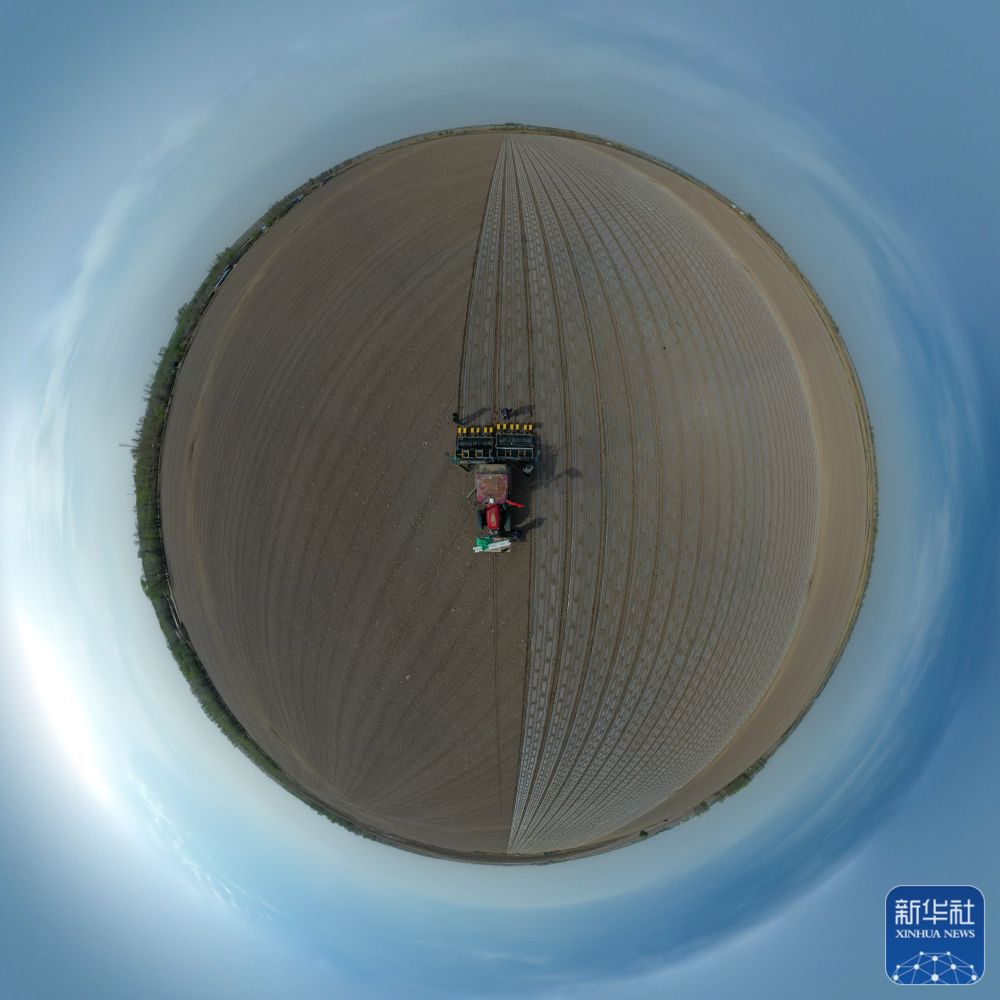 ↑这是4月19日在新疆生产建设兵团第六师共青团农场拍摄的棉花机械化春播现场(无人机球形全景照片)。新华社记者 丁磊 摄