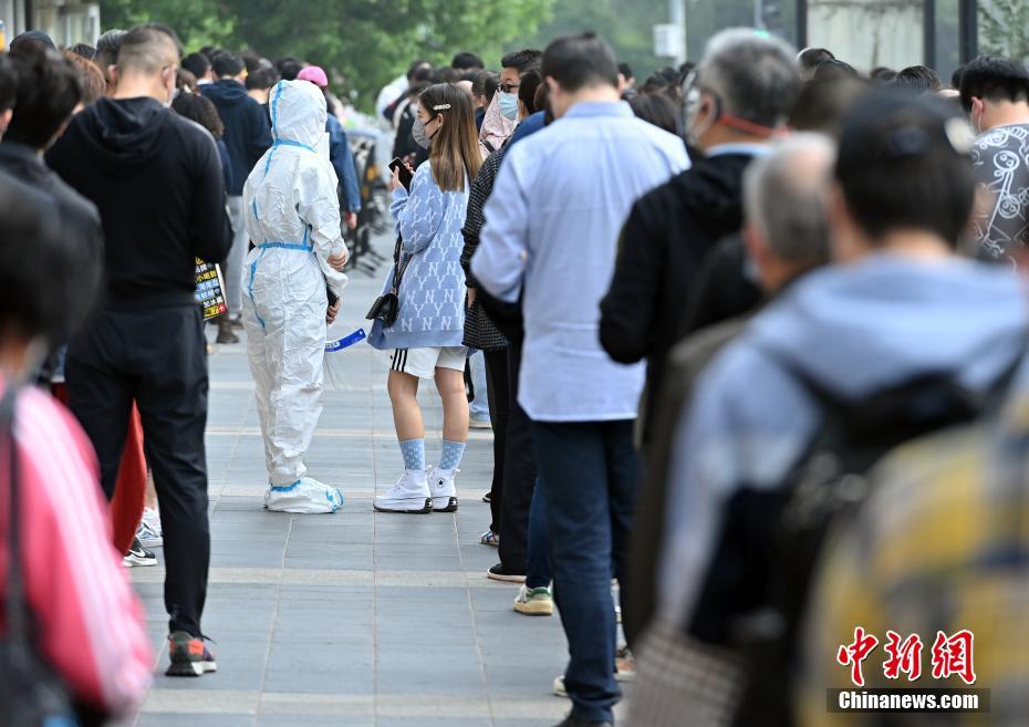 4月25日,北京市朝阳区望京地区的一处核酸检测点,在附近生活、工作的人群排队准备接受核酸检测。4月24日,北京市朝阳区副区长杨蓓蓓在发布会上表示,为有效阻断新冠肺炎疫情传播,确保全区居民生命安全和身体健康,经研判,朝阳区扩大核酸检测范围,从4月25日起全区进行常态化核酸检测,在25日、27日和29日进行三次检测。 中新社记者 侯宇 摄
