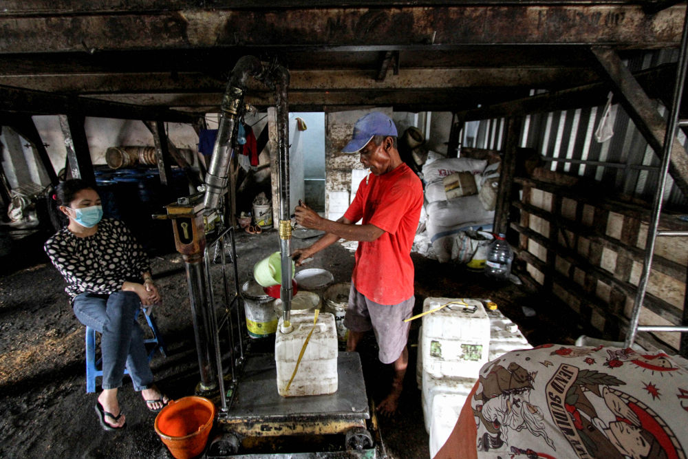 ↑4月26日,在印度尼西亚梭罗的一家传统市场,一名消费者(左)等待工人为她的油桶补充食用油。新华社发(布拉姆摄)