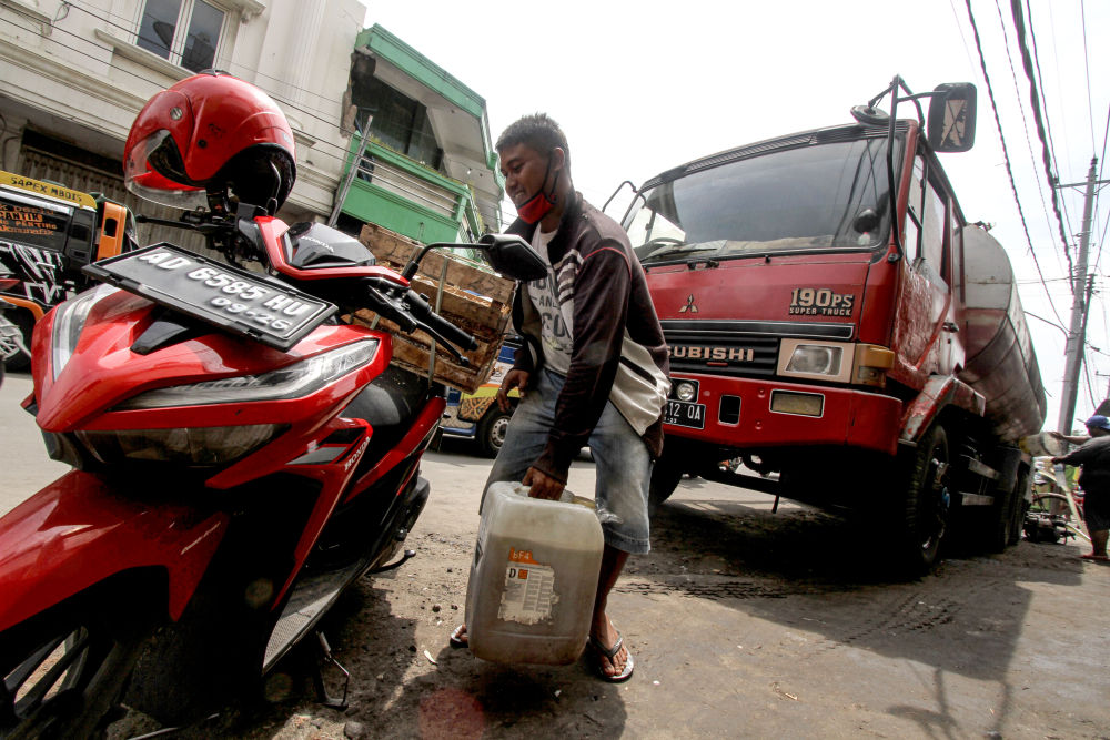 ↑4月26日,在印度尼西亚梭罗的一家传统市场,一名消费者准备将装有食用油的油桶放上摩托车。新华社发(布拉姆摄)