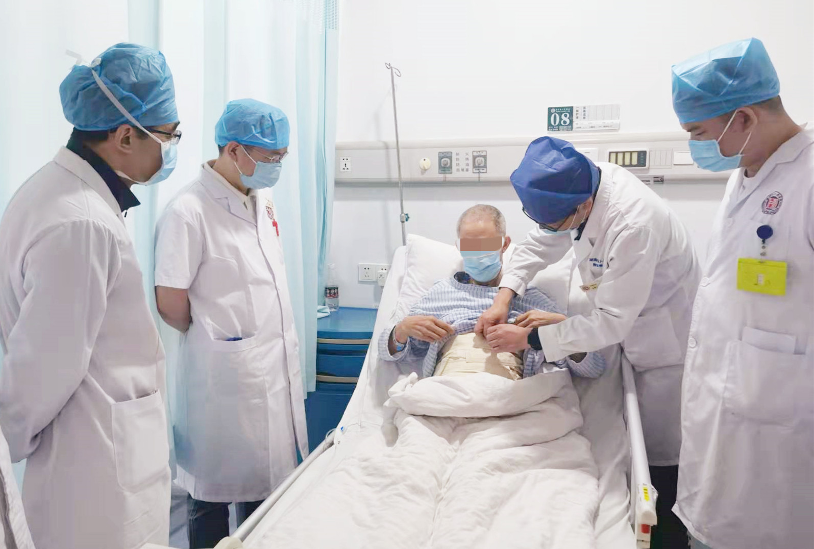 (医护人员查看患者术后恢复情况。)