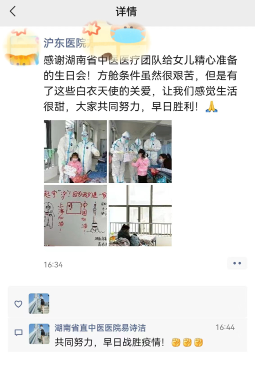 “感谢湖南省中医医疗团队给女儿精心准备的生日会!方舱条件虽然艰苦,但是有了这些白衣天使的关爱,让我们感觉生活很甜,大家共同努力,早日胜利!”