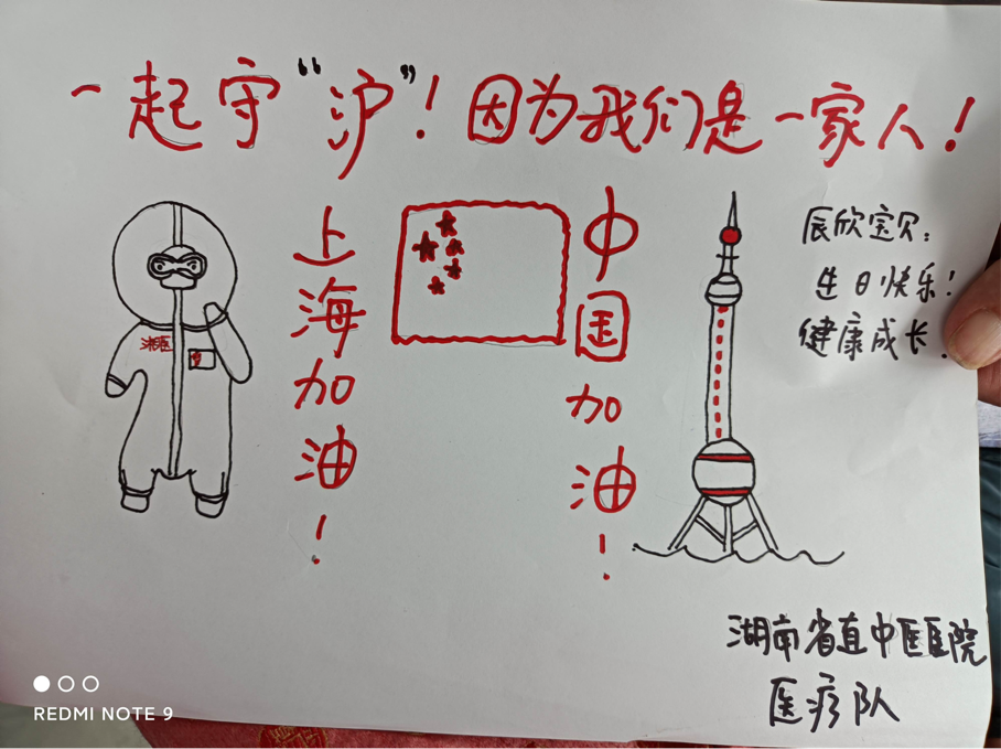 在手绘的大白、东方明珠、五星红旗图案周围,写着几句话:一起守“沪”!因为我们是一家人!上海加油!中国加油!辰欣宝贝,生日快乐!健康成长!”一幅满载爱心的简笔画由此诞生!