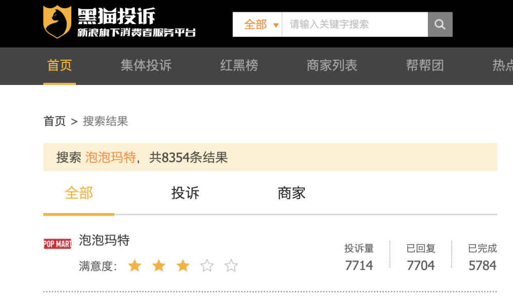 记者前往黑猫投诉平台,搜索泡泡玛特,其投诉量超7700条。“货不对板”“有瑕疵”“拒绝退货退款”“推行优惠互动却不履行”……网友在投诉区纷纷讲述自己不愉快的购物经历。