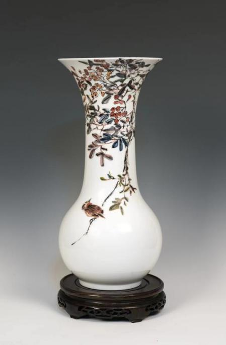 《花影相和满客衣》,南天竺的枝、叶、果从瓶口漫延至瓶身,饱浸了阳光、雨、露、风与霜,墨色的长枝缀着几片土青的叶子斜逸下来,一只鸟栖在枯枝上,尖喙,扭着脖项,斜睨着果子,那股子劲,有味有趣得很。生命是那么自由、烂漫、洒脱与畅快。