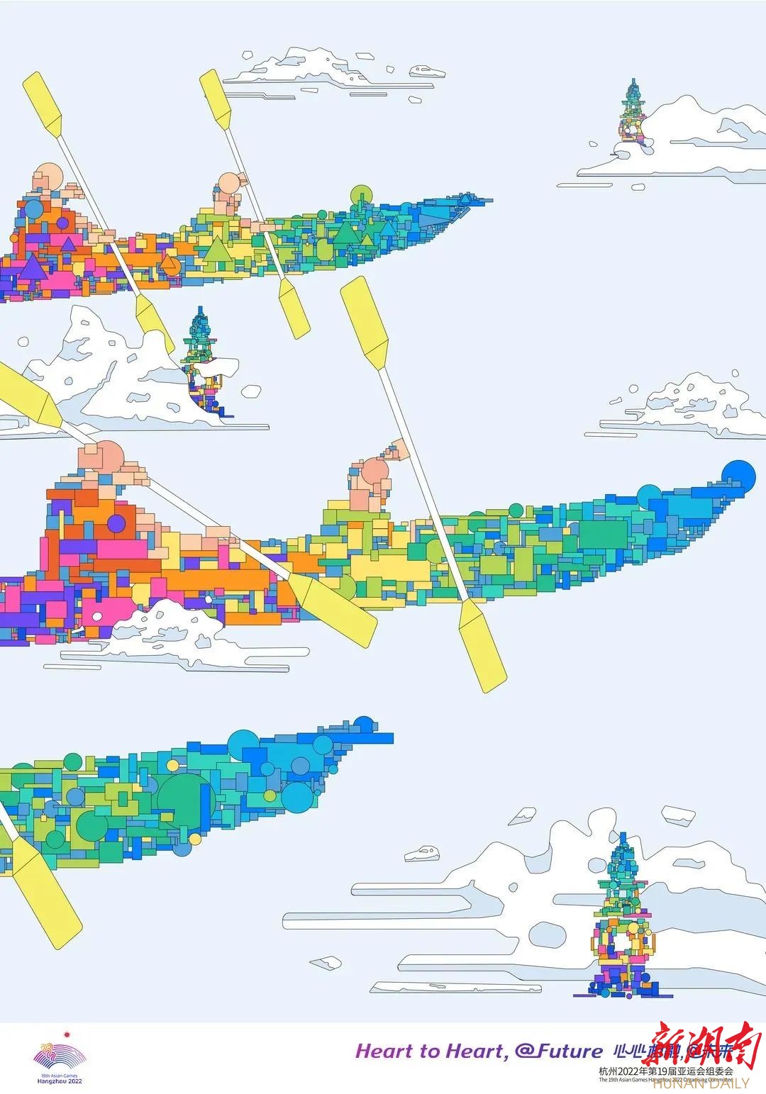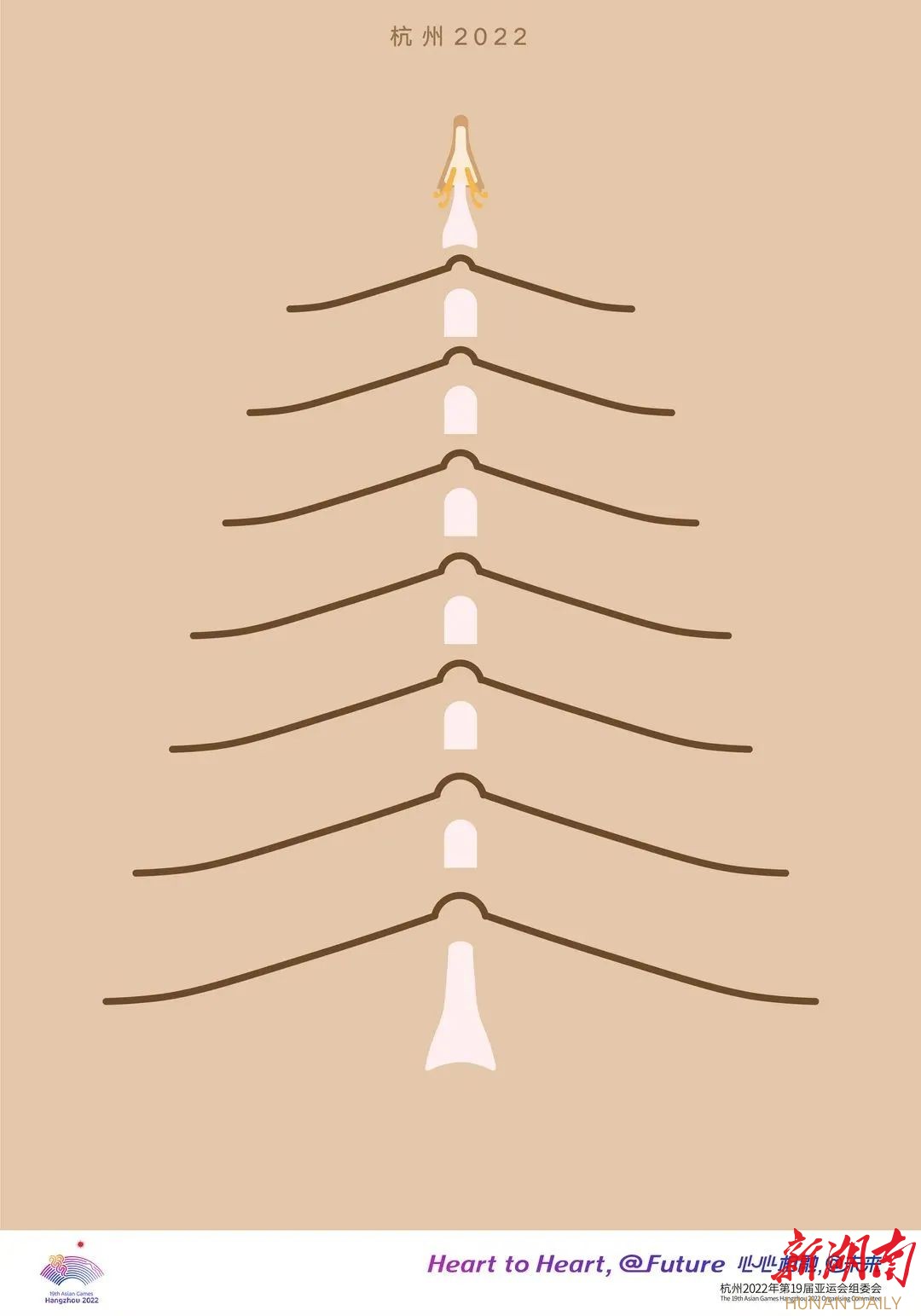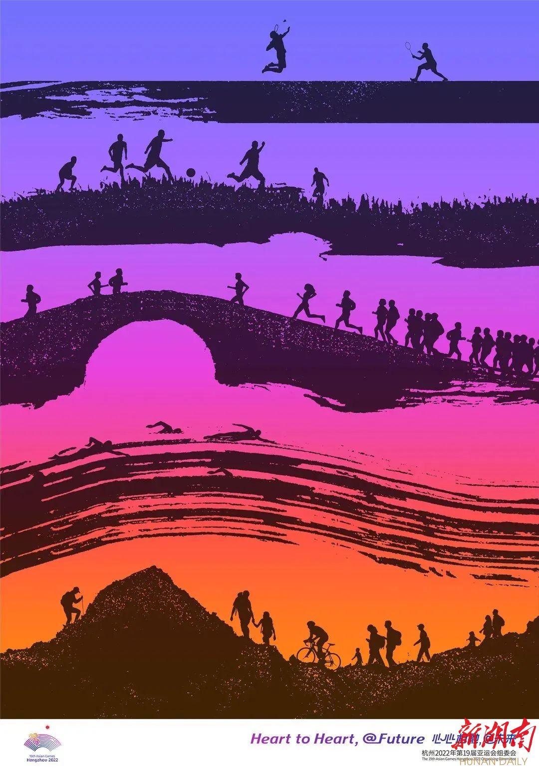这次发布的海报围绕“历史人文”“智能科技”“体育竞技”“幸福城市”主题,运用手绘、摄影、正负形等艺术手法,结合图形、文字、色彩等元素,以“线性”表达为串联,深入探讨亚运美学和奥林匹克精神。