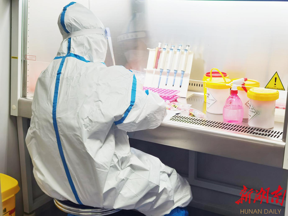 消杀、签收、分拣、编号、加样、提取、扩增、结果报告、环境消毒......每一步都是行走在刀尖上,零距离接触病毒,核酸检测检验师们从不敢粗心大意,每个步骤都必须严谨精准。密封的环境里,除了机器的声音和穿梭的脚步声,几乎没有声音,她们不停地争分夺秒,只为以最快的速度,出具最精准的结果。