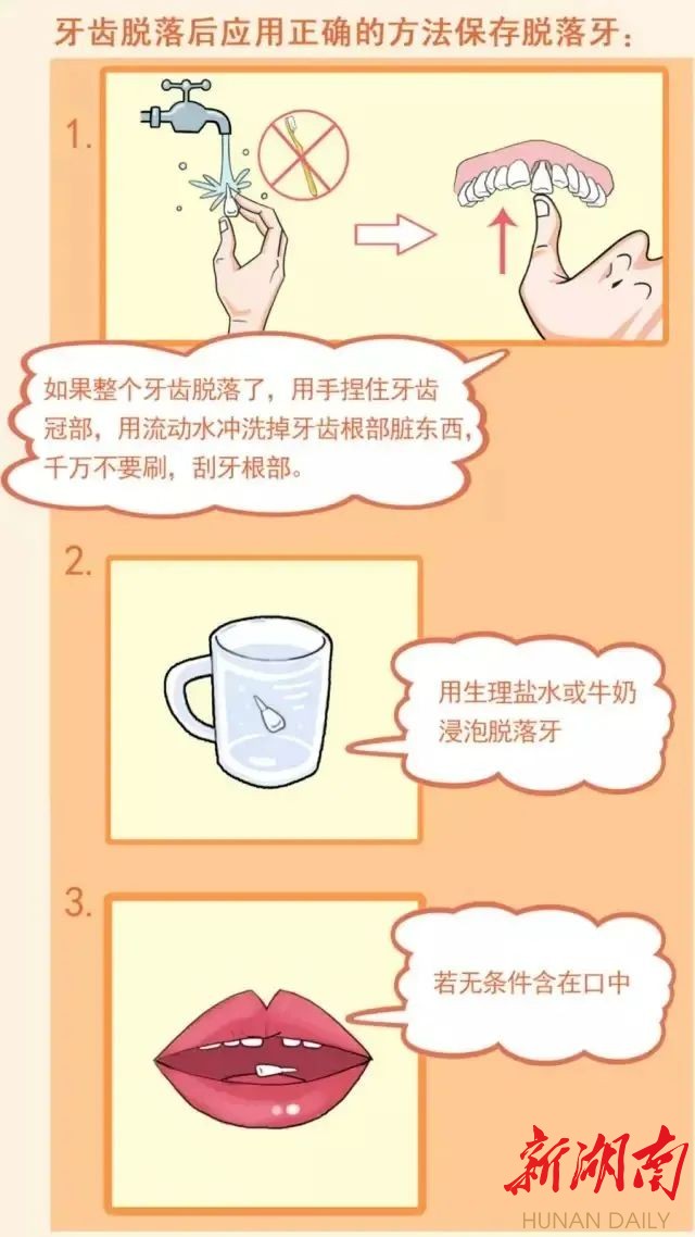 1.应立即找到牙齿,保存在生理盐水或牛奶中,并迅速就医,行牙齿再植术并予以固定。