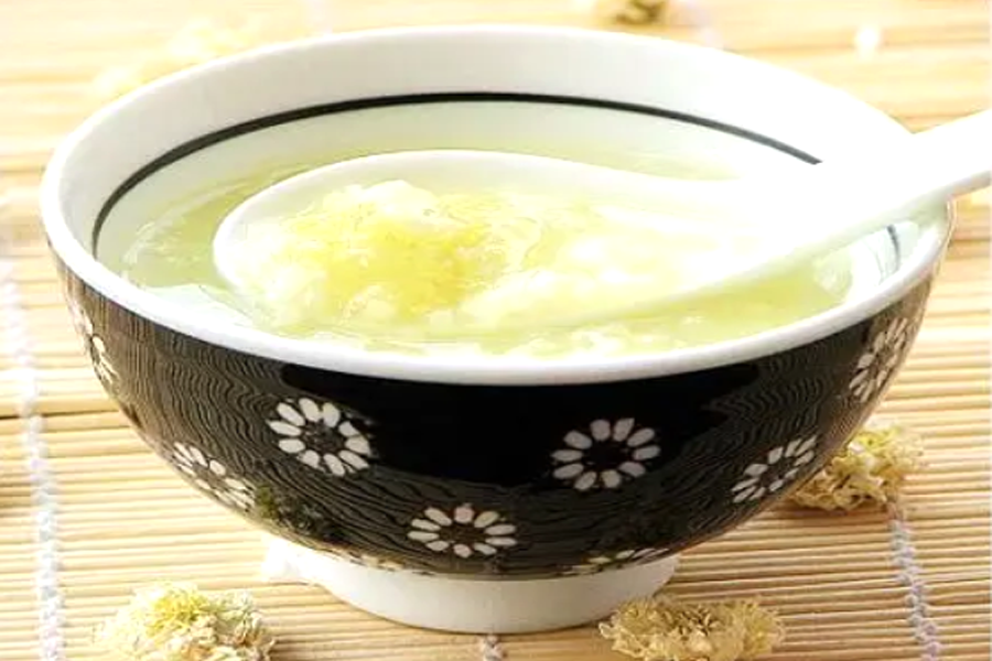 做法:取菊花(以杭白菊为好)20-30克,粳米100-150克。先将菊花用水煮沸15-20分钟,去渣留液;再将淘洗过的粳米放于药液中,或再加入适量清水,一同煮成粥。