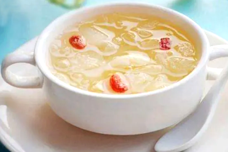 汤中银耳味甘淡而性平濡润,能养阴润肺、益胃生津,为滋补佳品;茉莉花味辛、甘,性微温,入肝、胃经,能健脾而理气开郁;鸡肝甘咸而微温,可入肝、胃经,能补肝益胃。此汤有补肝益肾、明目美颜之效,可顺应春日升发之气。