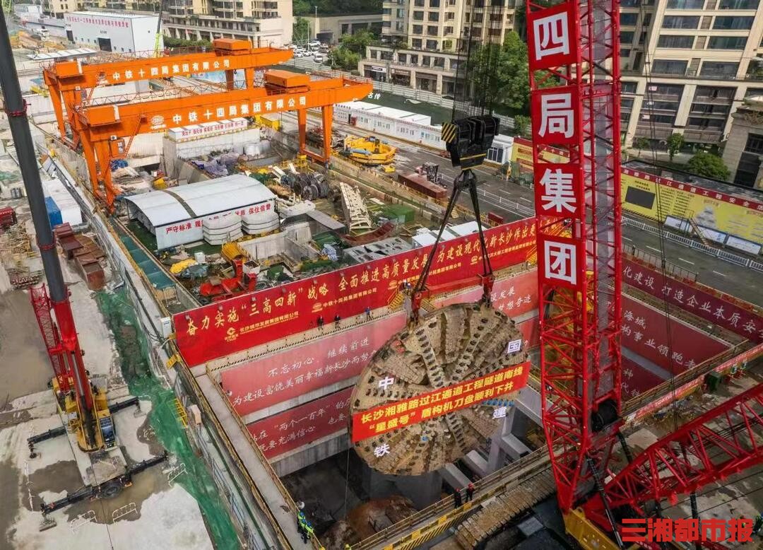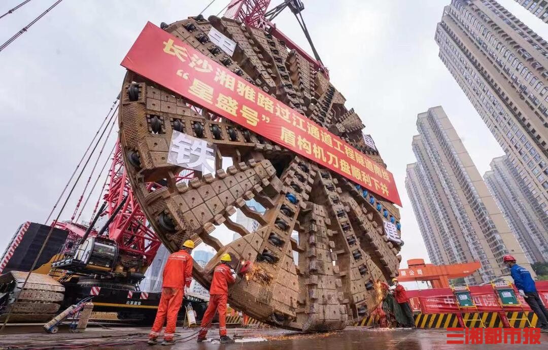 三湘都市报·新湖南客户端4月22日讯(全媒体记者 周可 通讯员 刘甲)4月19日上午,湖南省内应用的最大直径盾构机——长沙湘雅路过江通道工程“星盛号”盾构机刀盘顺利吊装进入隧道南线盾构始发井,这是“星盛号”盾构机这条“钢铁巨龙”继去年2月份盾构刀盘下井时隔一年之后,再次成功装上“巨牙”,这也标志着由长沙城市发展集团有限公司投资建设、中铁十四局集团施工的湘雅路过江通道工程南线隧道盾构机即将开启第二次穿越湘江之旅。