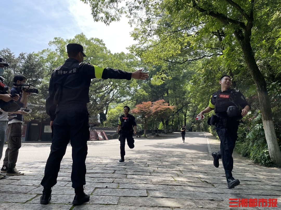 上午9时30分,30名全副武装的青年特警队员,身穿防弹背心、头戴防弹头盔、腰系警用八件套,携带的装备总重达10公斤。在岳麓山东门前坪集结完毕。随着一声令下,队员们以起跑就是冲刺的状态迅速向终点进发。