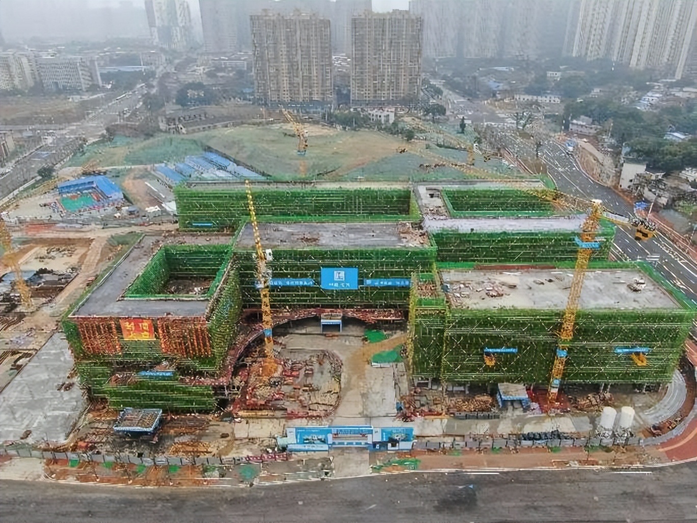 中建五局三公司承建的麓山国际实验小学二小项目现场,塔吊林立、拔地而起的教学楼雏形已现。