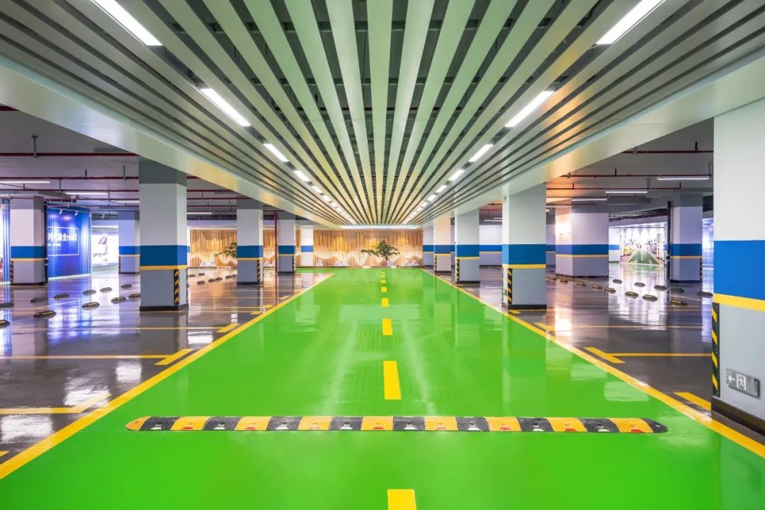 地下车库,采用恒温恒湿技术打造,全部采用栅格吊顶,地面以亚光防滑的环氧地坪漆铺设,颜值在线又实用。