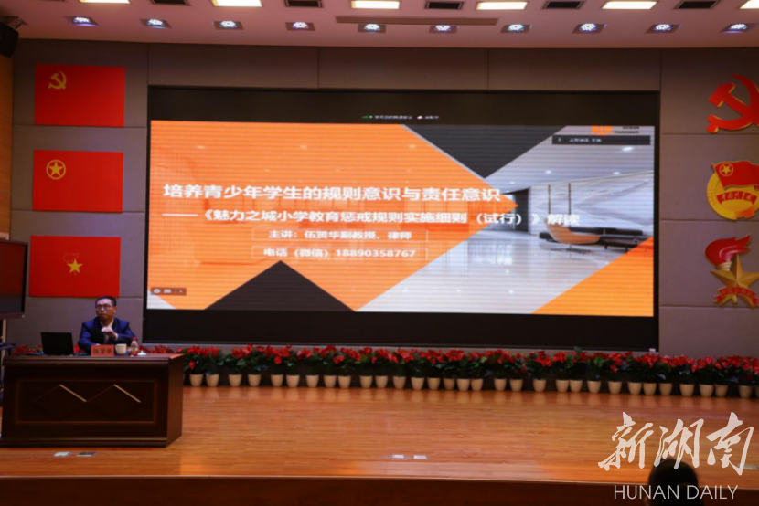 新湖南客户端4月26日讯(通讯员 丁君囡 黎蓉)“耶!我获得了伍教授的亲笔签名!”“伍老师,您讲得真好!”……为增强学生的纪律观念和法律意识,4月22日,雨花区砂子塘魅力之城小学邀请伍贤华教授,进行题为《培养青少年学生的规则意识与责任意识——〈魅力之城小学教育惩戒规则实施细则(试行)〉解读》的讲座。本次讲座,旨在根据四、五、六年级学生近段时间出现的普遍性和个性问题,组织师生再次深入学习教育惩戒细则,教给学生一定的规则意识与责任意识,推进学校教育惩戒细则的实施,全力促成学生健康成长与全面发展。伍教授深入浅出的讲述,在现场就收获了一大群小粉丝。