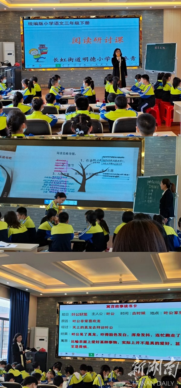 新湖南客户端4月25日讯(通讯员 陈艳琼 汪怡萍 殷熙彦 邓冬青)永州市长虹街道明德小学致力于打造书香校园,为培养学生广泛的阅读兴趣,让孩子博览群书,浸润书香,提高学生阅读能力和阅读品味。4月22日上午,在四楼多媒体教室隆重举行了低中高年级阅读教学示范课观摩暨研讨活动,3位优秀教师通过不同文本为学生讲解了多种多样的阅读方法,她们以扎实的教学基本功和深厚的文化底蕴,饱含激情的课堂氛围,赢得了听课者一致高评。