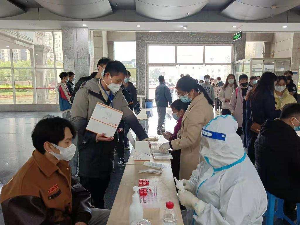 “明天早上7点多进行核酸检测,现场需要几名志愿者协助,请老师们自愿报名!”晚上10点多接到临时通知后,各个学院在群里转发了征集教师志愿者的消息,一时间原本安静的微信群一下子热闹了起来。短短几分钟,各学院教职工志愿者的报名人数迅速满额。“我们党员关键时刻一呼百应,令人感动。”文新学院党委书记伍接朝为学院广大党员闻讯而动深感自豪。在核酸检测现场,法学院数十名教师志愿者身着防护服、头戴防护帽、全副武装,协助医护人员做好核酸采集信息扫码、维持秩序等相关工作,虽然长时间工作导致汗流浃背,但是看着井然有序的队伍,他们觉得累并幸福着!