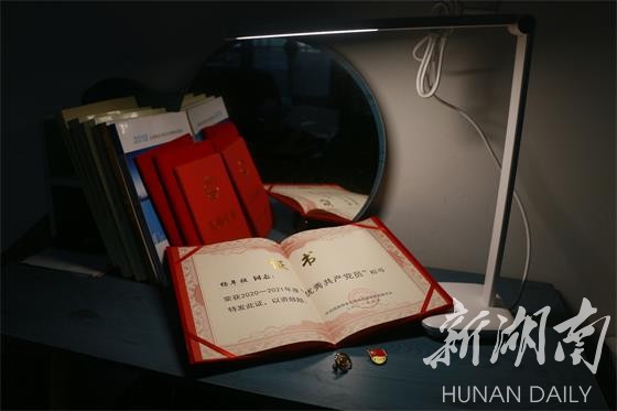 00:10,他终于回到家中,稍微洗漱一下便倒头睡下。党徽、税徽,以及“张家界市社保征收工作先进个人”“慈利县税务局优秀共产党员”等荣誉安静地躺在书桌上,台灯照耀下,与窗外夜空交相辉映,熠熠生辉……