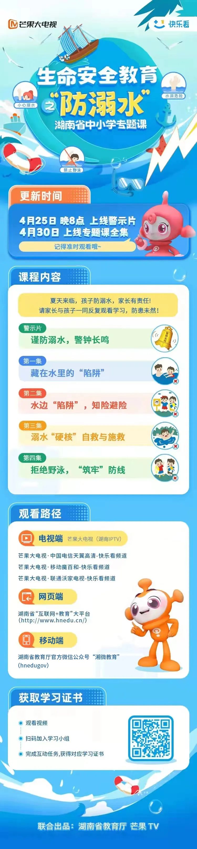 为了提升全省中小学生防范溺水安全意识和识险避险、遇险逃生、自救互救能力,省教育厅委托芒果TV精心策划制作了《生命安全教育之“防溺水”湖南省中小学专题课》,将于近期分批上线。4月25日晚8点,还将首次面向全省中小学生和家长推出警示教育片。