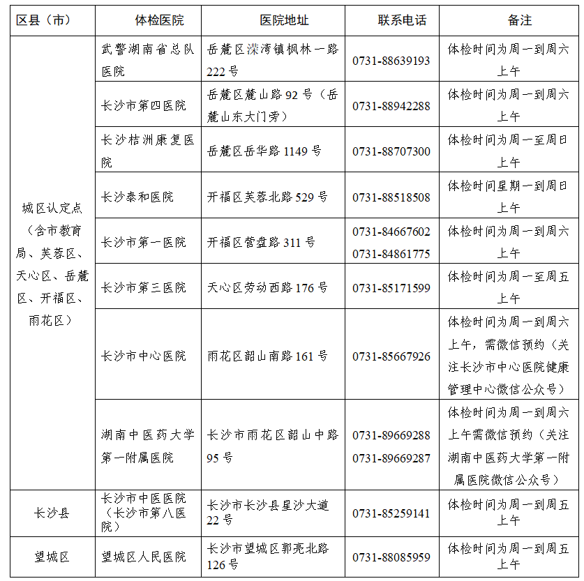 长沙市2022年春季高中段教师资格认定体检指定医院