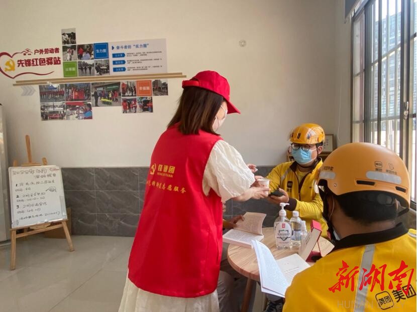 (“先锋红色驿站”内,志愿者为户外劳动者提供暖心服务。)