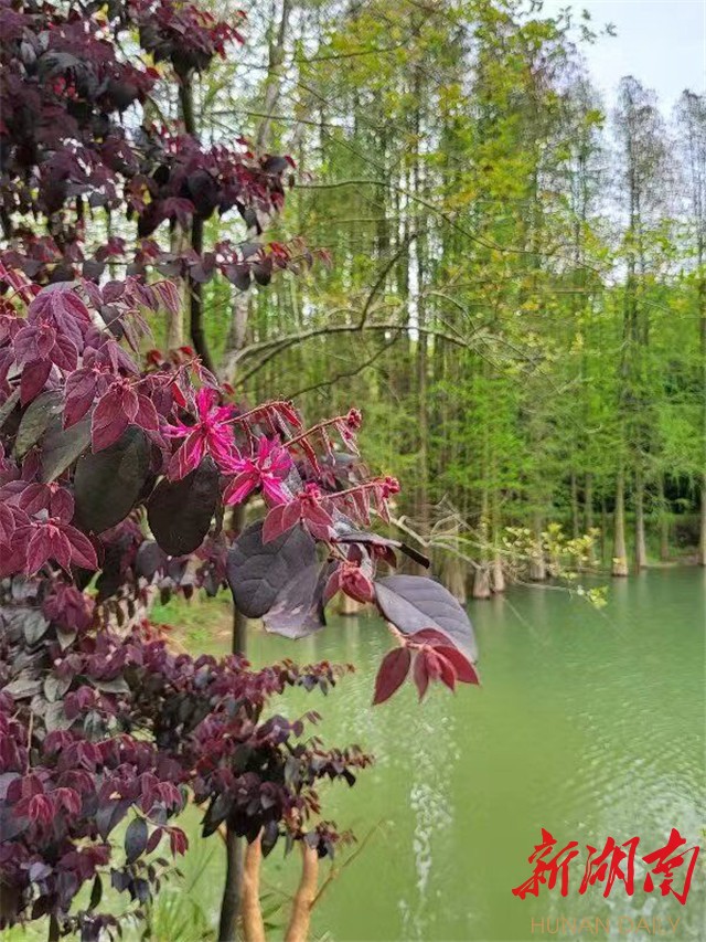 水杉齐齐整整站在月牙湖西头,像经过层层选拔出来的帅小伙,个个身姿挺拔。入水的树干超两米,却没有挽起裤脚,不怕春水泡坏外面的衣裳,也不见扭动身子,表达嬉水的矫情。四周的树木品种很多,有檫树、樟树、国外松、枫树等,一层又一层,裹出了原始丛林的气息。远一点的,踮起了脚尖,只想露出爱美的容颜,挤在中间的小个子,伸出小枝牙招招手,就连路边的小花小草,也跑到脚底下,好像抢着告诉我们,它们也是这里的娃子。