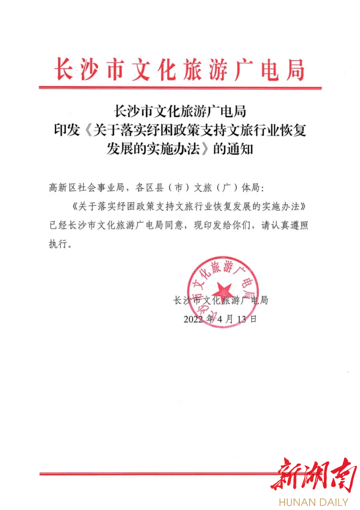 湖南日报·新湖南客户端4月14日讯(记者 熊远帆)记者今天从长沙市文化旅游广电局获悉,4月13日,该局下发了《关于落实纾困政策支持文旅行业恢复发展的实施办法》,共8条措施帮助市场主体渡过难关、恢复发展,增强文旅企业获得感,稳住行业发展基本盘。