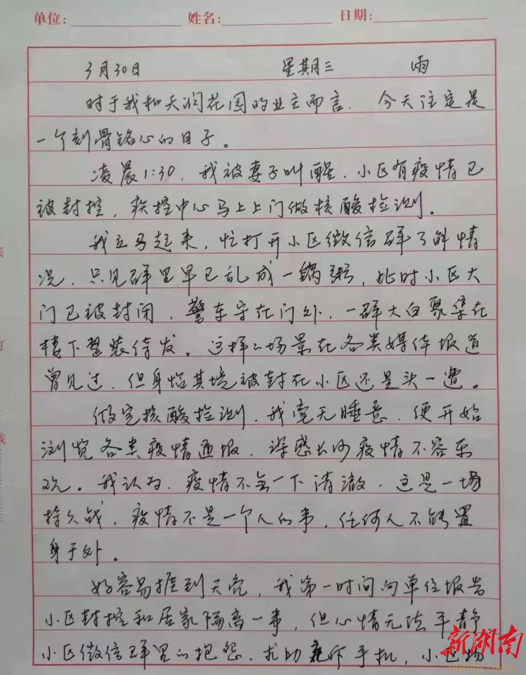 “封控前两天,业主群里还充斥着恐慌、责怪和求助声,从第三天起,小区业主对志愿者的赞许和感恩常常刷屏,我感叹或许这就是爱的力量……”这段文字摘自于长沙市雨花区左家塘街道王公塘社区天润花园小区防疫临时党支部书记李智杰的《2022年天润花园疫情封控纪实日记》。从3月30日至4月12日,在小区14天的封控期间,作为一名有着30年党龄的老党员李智杰,不仅冲锋在抗疫一线,还坚持每天手写日记,将封控小区里的“温情与坚守”通过朴实无华的文字记录下来,无论多晚从没间断过。