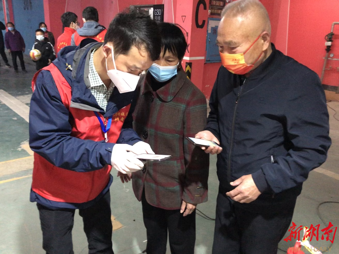 网格指导员帮助老年人扫场所码、了解疫苗接种情况。