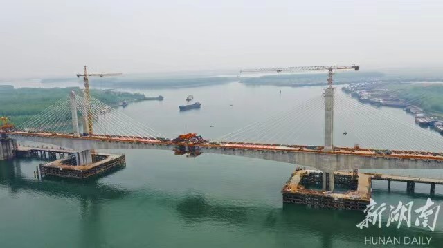 (常益长高铁关键控制性工程——沅江特大桥主跨顺利合龙。郭立亮摄)