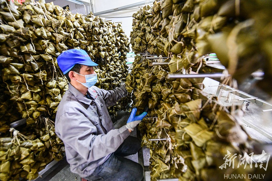 4月30日,浏阳市关口街道道源湖村道源湖农业发展有限公司生产车间,工人在打包粽子。该村有3家粽子加工厂,有150余户村民从事粽子制作和经营工作,去年全村粽子总产值达8000万元。道源湖村被当地誉称为“粽子村”。 彭红霞 摄