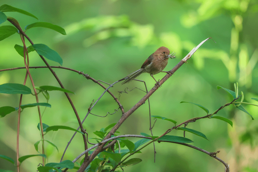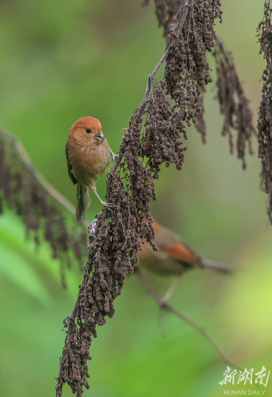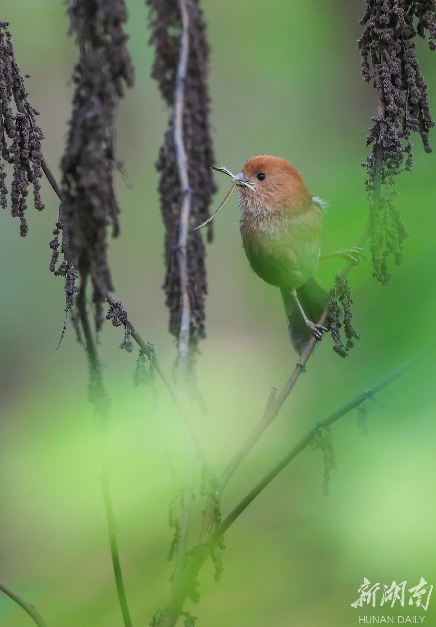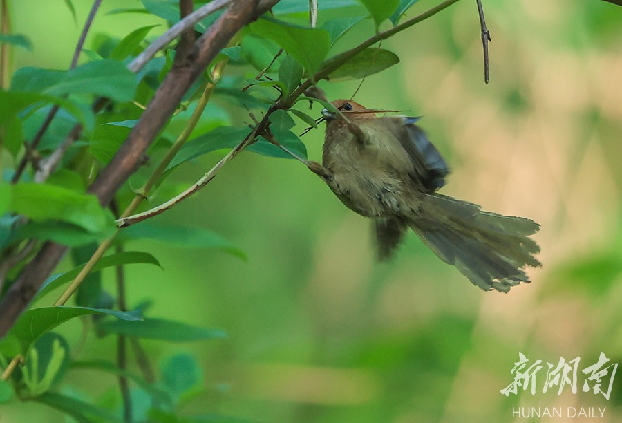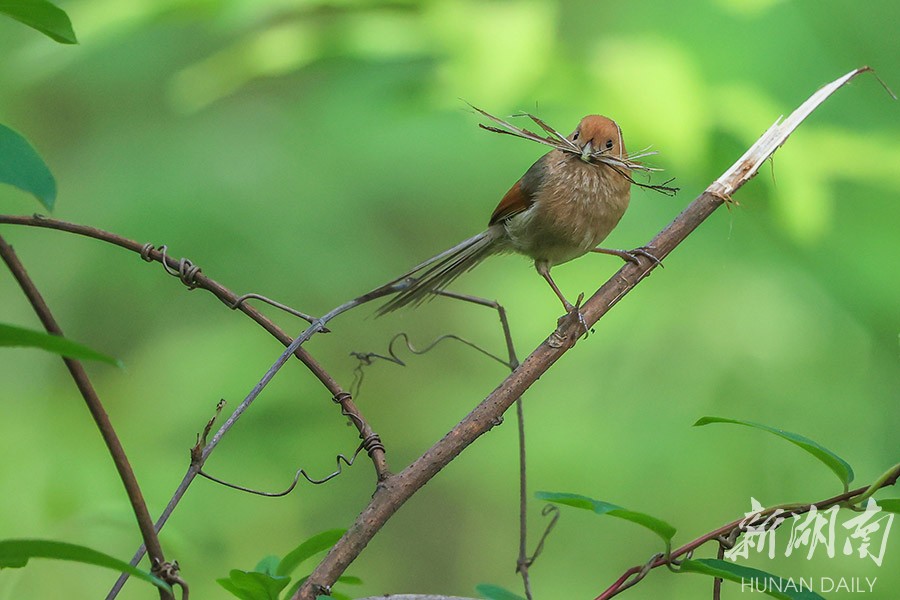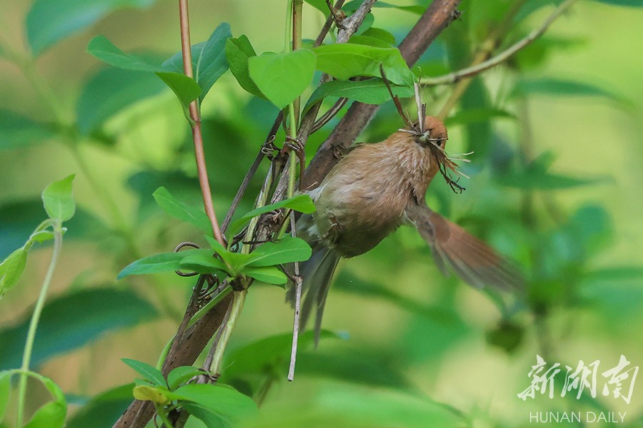 4月28日,湖南烈士公园,棕头鸦雀四处寻觅“建筑材料”,准备营建爱巢。