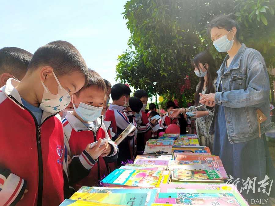 4月21日,衡山县星源学校,学生在“书摊”淘书。“世界读书日”来临之际,衡山县图书馆与该校联合开展书市进校园活动,营造浓厚的全民阅读氛围,培养学生多读书、读好书的习惯。胡程远 唐有权 摄影报道