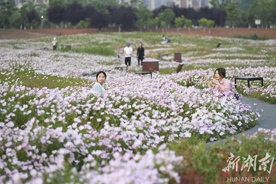 4月20日,长沙洋湖国家湿地公园,市民在月见草花海里留影。近期,随着天气日渐转暖,该公园里的月见草进入盛花期,放眼望去,美轮美奂。湖南日报全媒体记者 辜鹏博 摄