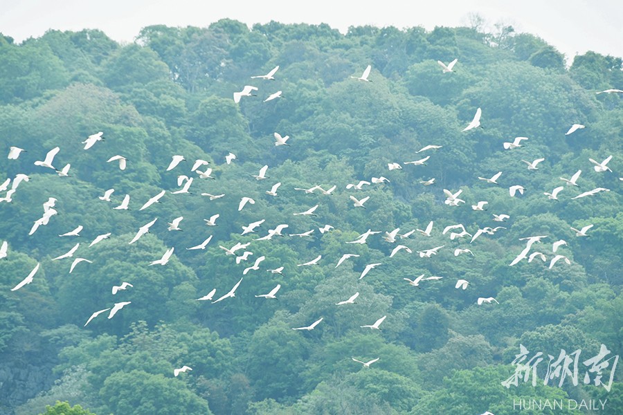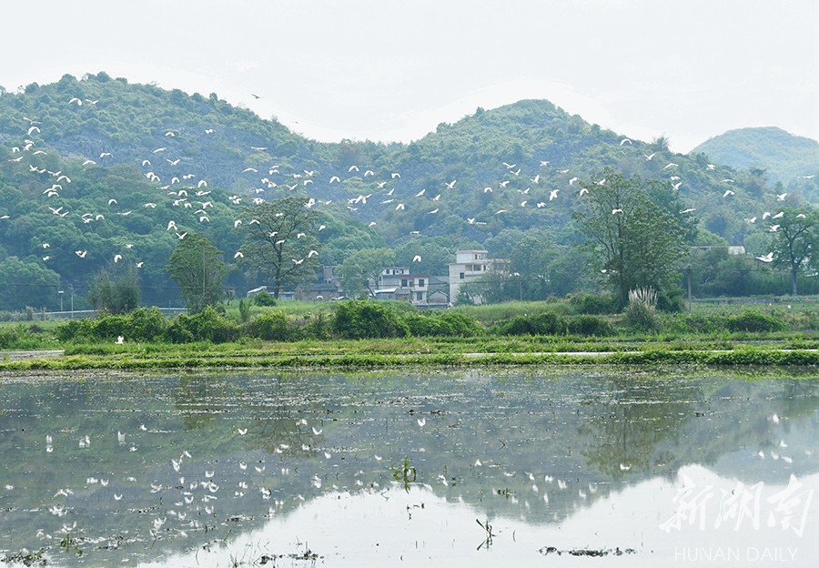 4月12日,江永县潇浦镇铜岩村,成群的白鹭在田野觅食、飞翔,构成一幅美丽和谐的生态田园画卷。田如瑞 摄