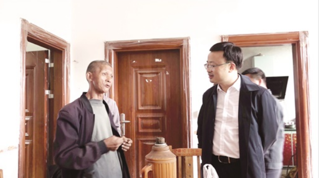 ▲2021年10月9日,宜章县委主要负责人(右一)来到杨梅山镇李家塘村,走访慰问该村特困人员谷陡别。宋素洁 摄