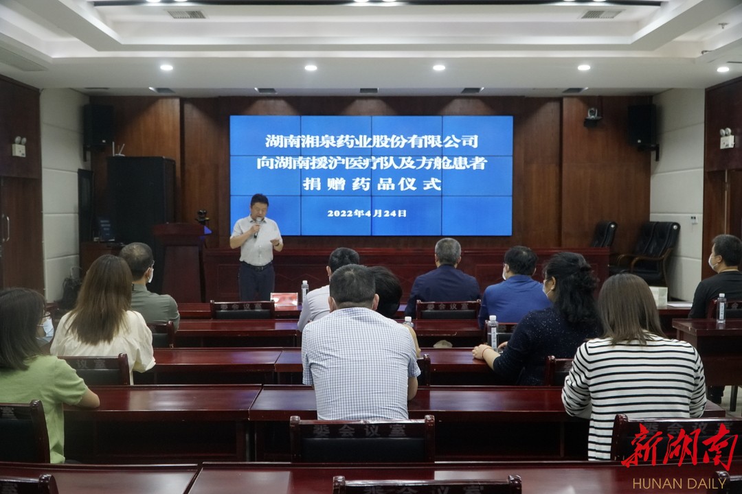 湖南日报•新湖南客户端4月24日讯(记者 向莉君 通讯员 田晓辉 胡建)今天下午,湖南湘泉药业股份有限公司向湖南援沪医疗队及方仓患者捐赠药品仪式,在州卫健委举行,公司现场捐赠1万盒肠康片支持上海抗疫。湘西州卫健委党组书记、主任彭云,湘泉药业股份有限公司董事长王卫民参加捐赠仪式。