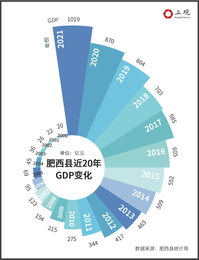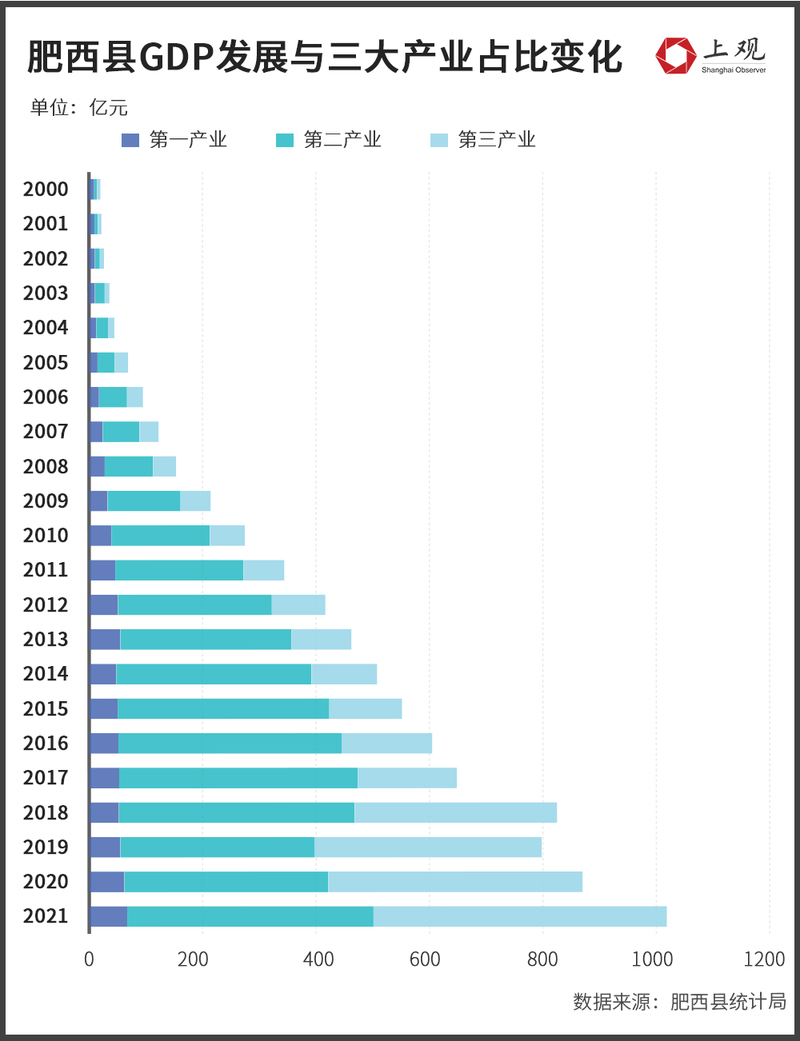 2000年,肥西县生产总值仅为20.4亿元,其中第一产业的占比高达47.5%,第二产业与第三产业的占比仅为25.89%与26.61%。当时,在安徽省公布的20个县市中排名倒数第二,与第一名怀远县的差距达到18.22亿元。