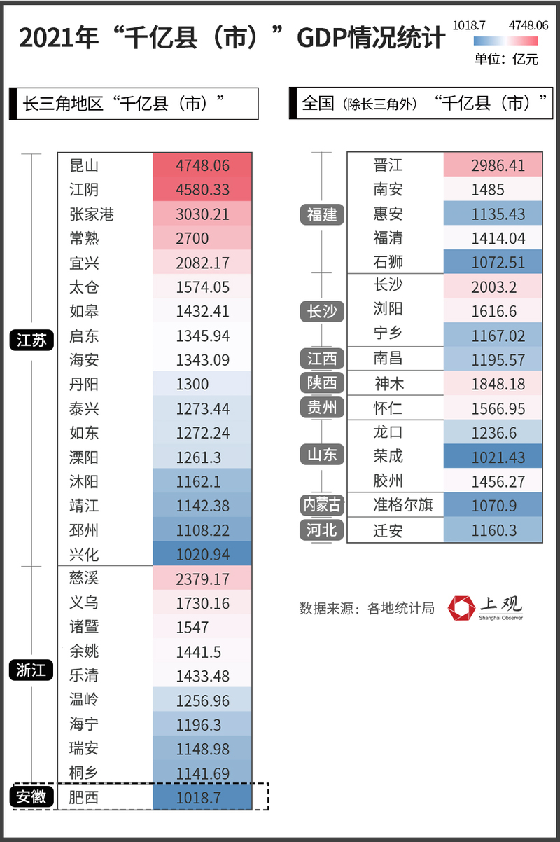 江苏省是“千亿县”数量最多、且实力最强的省份,共有17个“千亿县”。其中,昆山、江阴、张家港的GDP在43个县域中遥遥领先,昆山2021年的GDP达到4748.06亿元,位列全国第一。